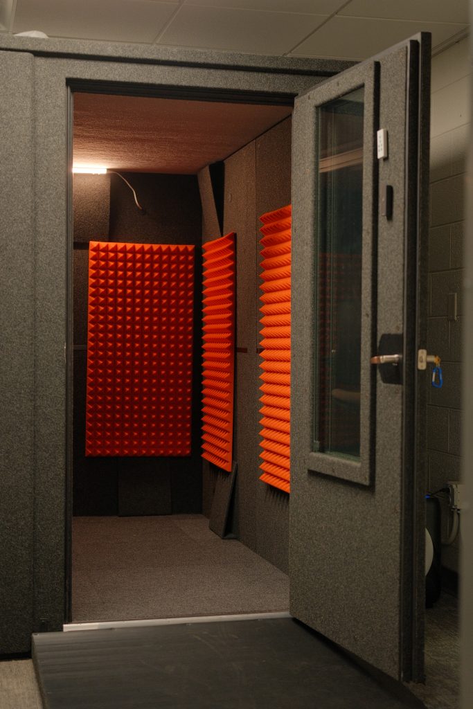 This room contains a Whisper Room recording suite, outfitted with an iMac with Adobe Audition so students can do ADR (“Automated Dialogue Replacement”) and foley (adding footsteps, sound effects, etc.) for both live action and animated films.