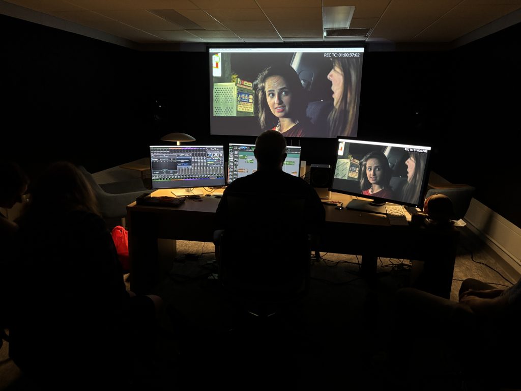 This room is used for class demonstrations and upper level student projects. The room features three monitors, including a dedicated professional monitor for color grading, a Blackmagic Color Panel, and video projection to simulate what one encounters in professional post-house environments. For sound, the room is outfitted with 5.1 surround sound and a full AVID ProTools license.