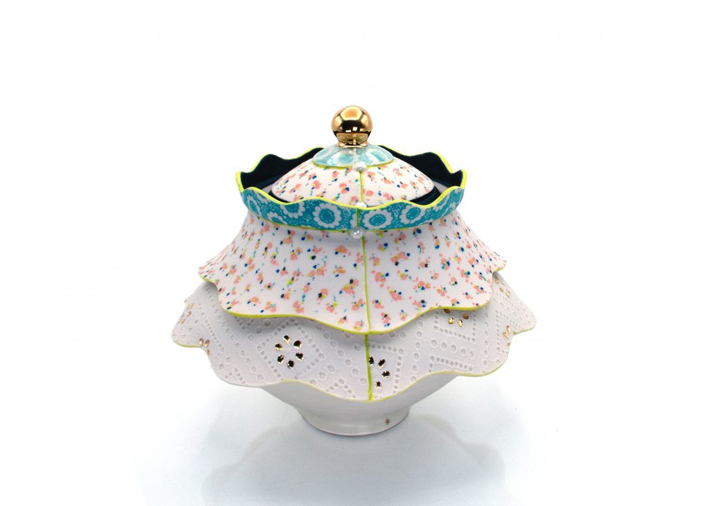 My work is very functionally driven. I use translucent porcelain clay, and I use techniques that view clay slabs as fabric and the vessel as body, turning flat patterns into three-dimensional forms. Historically, vessels and bodies have been compared. We even talk about vessels in that way; there’s a lip, a body, a foot, a shoulder. In my third year of graduate school at Ohio University, I developed the technique where I cast fabric textures as a monoprinted porcelain slab and combine slab building and wheel throwing techniques to create my work.