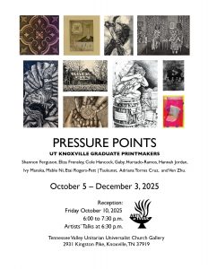 The UTK MFA printmakers are having a group show at TVUUC. Their show, Pressure Points, will be up from October 4th to December 4th.